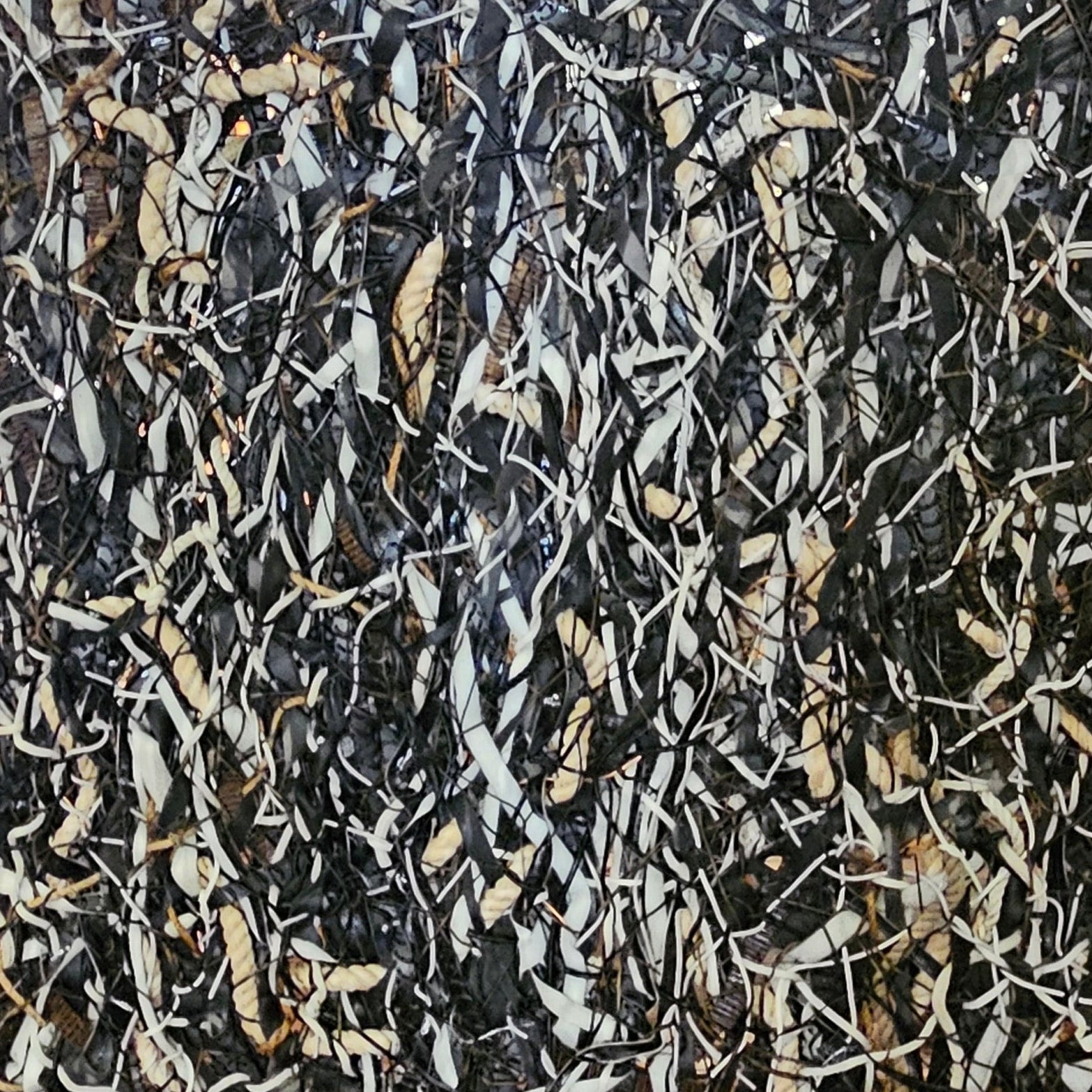 "Front Row at the Rock Show", repurposed mediums: conveyor belt, cardboard, firehose, natural and synthetic rope, cords, aluminum and copper wire, 54" H x 58" W
